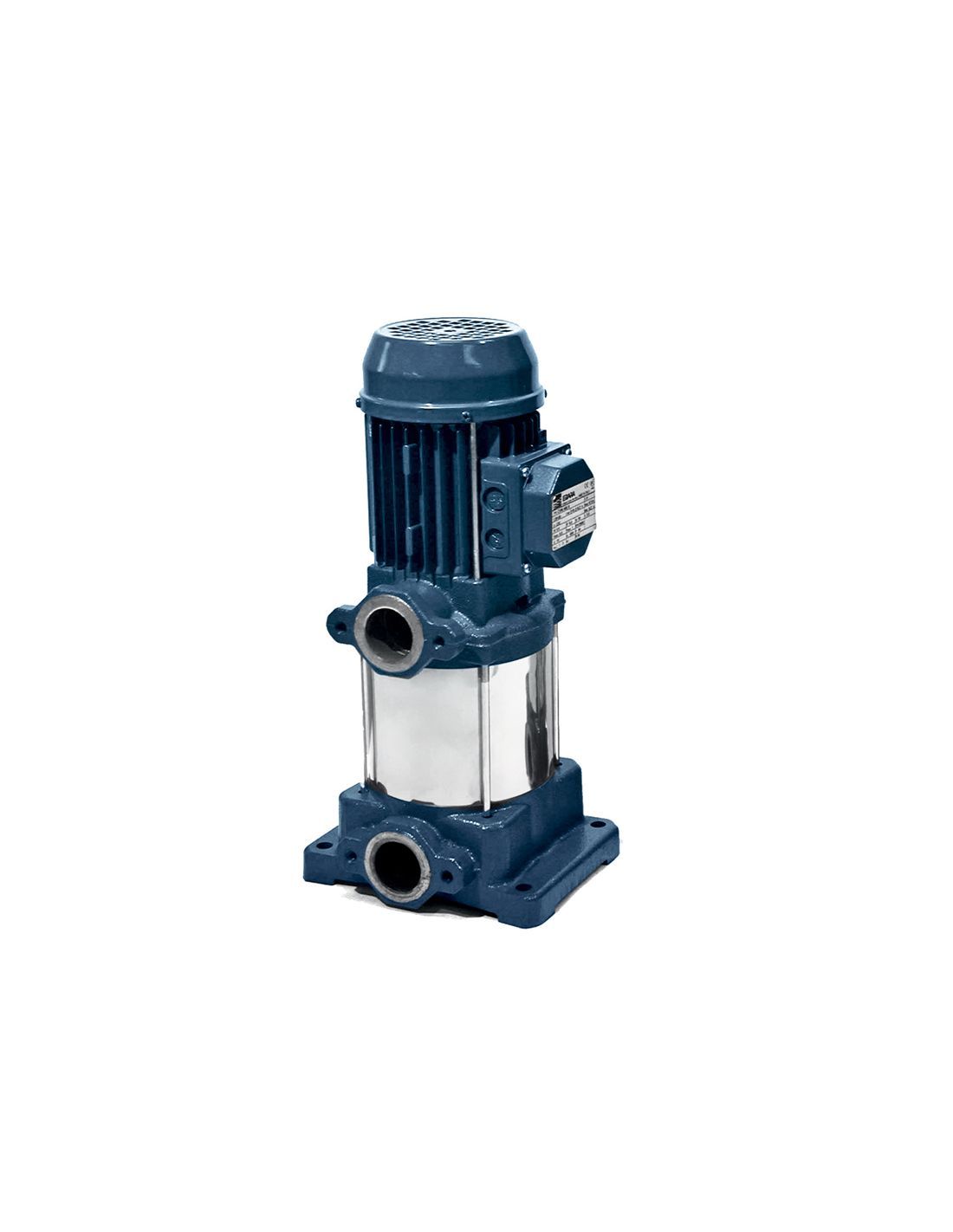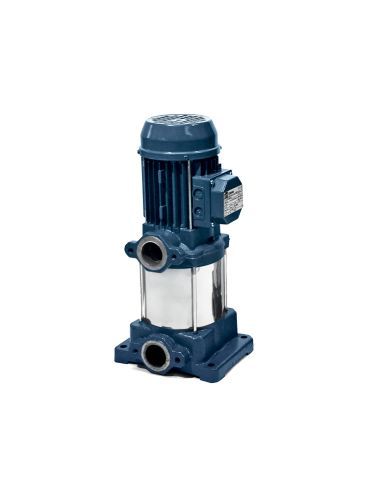 Pompe centrifuge verticale multicellulaire en fonte, caractérisée par des étages en technopolymère renforcé de fibres de verre et base en fonte. Équipée de série de contre-brides.